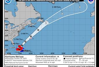 A las 8 de la mañana de este miércoles, Melissa se ubicaba en 20.6 norte y 75.7 oeste.Se espera que Melissa origine este miércoles entre 10 a 20 pulgadas en Cuba, enre 3 a 6 pulgadas en Jamaica y entre 2 a 6 pulgadas en Haití y República Dominicana (el sur y frontera).