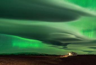 Normalmente, las auroras tienen lugar por encima de las nubes. El resplandor de la aurora se crea cuando las partículas expulsadas por el Sol se mueven rápidamente y impactan en la magnetosfera de la Tierra, entonces las partículas cargadas caen en espiral en el campo magnético de la tierra y golpean los átomos y las moléculas de la atmósfera. Un átomo de oxígeno, por ejemplo, brillará con la luz verde habitualmente emitida por una aurora tras recibir energía por la colisión. La parte más baja de una aurora se encuentra generalmente a 100 kilómetros de altura, mientras que la mayoría de nubes se encuentran por debajo a unos 10 kilómetros. La fotografía, tomada desde Dyrholaey (Islandia), pone de manifiesto las alturas relativas de las nubes y de las auroras. Inicialmente, el voluntarioso astrofotógrafo soportó fuertes vientos y cielos nublados en un intento de captar la aurora por encima de un faro, pero mientras iba hizo la fotografía por casualidad.