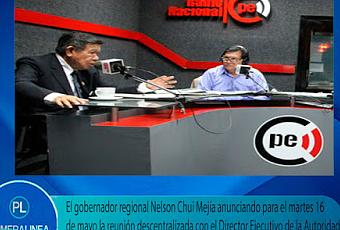 Sostendrá reunión descentralizada donde participarán los 128 alcaldes de la región Lima, presidentes de las Juntas de Regantes y representantes de la Sociedad Civil – anunció lo hizo el gobernador Nelson Chui desde radio NacionalEl principal problema en las nueve provincias es la descolmatación de los ríos, enrocado y defensa ribereña en las once cuencas hidrográficas, que demandará una fuerte inversión – informó el gobernador regional Nelson Chui Mejía – al momento de anunciar que este martes 16 de mayo se reunirá en la provincia de Huarochirí con el Director Ejecutivo de la Autoridad para la Reconstrucción Pablo de la Flor.