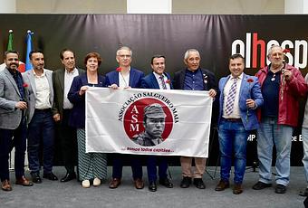 Andrade da Silva junto a Gallardo, al que regaló una camiseta con la figura de Salgueiro Maia. Luis Carvalho (Secretario de la Associação Salgueiro Maia) a izquierda del lector y Ricardo Cabezas (diputado de Cultura) a la derecha.