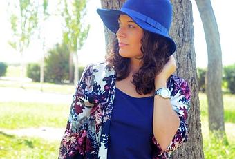 En mi caso, yo llevo pantalones blancos con una camiseta básica en azul marino, muy simple, pero he jugado con los complementos dándole un toque de color burdeos en los zapatos y el bolso, un toque azul en el sombrero y un mix de ambos en el kimono de flores. ¿Qué os parece el resultado?