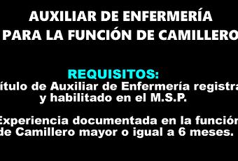 REQUISITOS EXCLUYENTES ESPECÍFICOS (a controlar por el Tribunal)• Experiencia documentada en la función de Camillero mayor o igual a 6 meses.