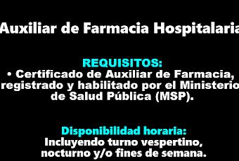 REQUISITOS:• Certificado de Auxiliar de Farmacia, registrado y habilitado por el Ministerio de Salud Pública (MSP).Este requisito deberá cumplirse indefectiblemente al vencimiento del período deinscripción por Internet.· Disponibilidad horaria: Incluyendo turno vespertino, nocturno y/o fines de semana.