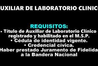 REQUISITOS EXCLUYENTES GENERALES (a controlar por la Oficina RR.HH./personal)• Certificado / Constancia de Postulación del Portal Uruguay Concursa.• Cédula de identidad vigente.• Credencial cívica.• Título de Auxiliar de Laboratorio Clínico registrado y habilitado en el M.S.P.• Haber prestado Juramento de Fidelidad a la Bandera Nacional• Formulario para Presentación a Llamado a Concurso disponible en la página web de A.S.S.E.