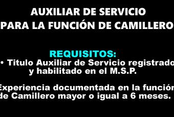 REQUISITOS EXCLUYENTES GENERALES (a controlar por la Oficina RR.HH./personal)• Certificado / Constancia de Postulación del Portal Uruguay Concursa.• Cédula de identidad vigente.• Credencial cívica.• Titulo Auxiliar de Servicio registrado y habilitado en el M.S.P.• Haber prestado Juramento de Fidelidad a la Bandera Nacional.• Formulario para Presentación a Llamado a Concurso disponible en la página web de A.S.S.E.REQUISITOS EXCLUYENTES ESPECÍFICOS (a controlar por el Tribunal)• Experiencia documentada en la función de Camillero mayor o igual a 6 meses.4. REQUISITOS A VALORAR (a valorar por el Tribunal)• Escolaridad• Capacitación Complementaria• Antigüedad en la función• Desempeño Acreditado• Certificado de curso de Camillero• Haber desempeñado funciones como Camillero en el Hospital Pasteur