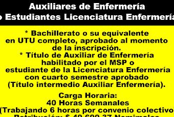 Requisitos Específicos:1) Ser ciudadano natural o legal.2) Bachillerato o su equivalente en UTU completo, aprobado al momento de la inscripción.3) Título de Auxiliar de Enfermería habilitado por el MSP o estudiante de la Licenciatura Enfermería con cuarto semestre aprobado (Título intermedio Auxiliar Enfermería).4) Título de Vacunador habilitado por el MSP.5) Demás documentación solicitada en las bases del llamado.