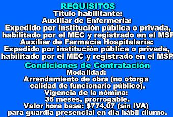 🎯 Requisitos de los AspirantesAl cierre del período de inscripción, los postulantes deberán cumplir con:Título habilitante:Auxiliar de Enfermería: Expedido por institución pública o privada, habilitado por el MEC y registrado en el MSP.Auxiliar de Farmacia Hospitalaria: Expedido por institución pública o privada, habilitado por el MEC y registrado en el MSP.Situación laboral: No desempeñar funciones remuneradas en la Administración Pública al momento del ingreso (con excepciones legales).Antecedentes: No haber sido destituido de un organismo público.Aptitud física: Contar con Carné de Salud vigente al momento del ingreso.