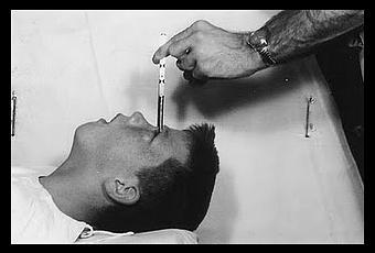 La técnica consiste en aturdir a los pacientes con un golpe y, mientras están bajo el efecto del "anestésico", introducir con fuerza un picahielo entre el globo ocular y el párpado a través del techo de la órbita, hasta alcanzar el lóbulo frontal; en este punto se efectúa un corte lateral moviendo el instrumento de una parte a otra. Lo he practicado en ambos lados a dos pacientes y a otro en un lado sin que sobreviniera ninguna complicación, excepto en un caso un ojo muy negro. Puede que surjan problemas posteriores, pero parece bastante fácil, aunque ciertamente es algo desagradable de contemplar. Hay que ver como evolucionan los casos, pero hasta ahora los pacientes han experimentado un alivio de los síntomas, y sólo algunas de las nimias dificultades de comportamiento que siguen a la lobotomía. Incluso son capaces de levantarse e irse a casa al cabo de más o menos una hora.