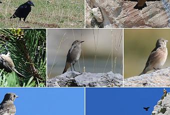 En este collage se observan varias especies típicas de alta montaña: dos cuervos y un buitre leonado. En las imágenes centrales, un carbonero garrapinos, un colirrojo tizón y un pardillo común. Finalmente, en las fotos inferiores se distingue un roquero solitario y, en el aire, chovas piquigualdas volando junto a un buitre.