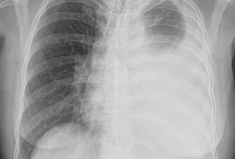 -Campos pulmonares, derecho sin evidencia de opacidades, nódulos o masas. Pulmón izquierdo, con radioopacidad en segmentos inferiores, de un 70% aproximadamente, con efecto de masa desplazando mediastino hacia lado derecho.
