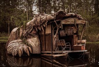 Nuestra recreación de Tom es verdaderamente impresionante: con 12 metros de largo, sus mandíbulas abiertas tienen casi el doble de altura que una persona. Dentro de su vientre se encuentra una cabaña de seis metros, inspirada en la misma donde vive Hazel, la protagonista de South of Midnight.