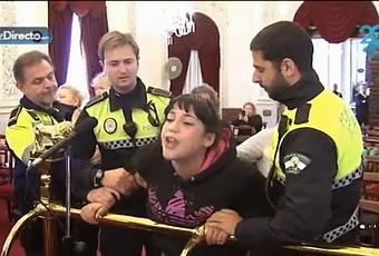 Los policías lograron llevársela a la fuerza mientras ella no dejaba de gritar: Contéstame. Yo me acerco a usted y la miro a la cara. Que me mires, que me mires a la cara. Que me mires por favor. Que me mires. A la cara me vais a mirar y me lo vais a decir. Sinvergüenza. Sinvergüenza. Ustedes no habláis”….