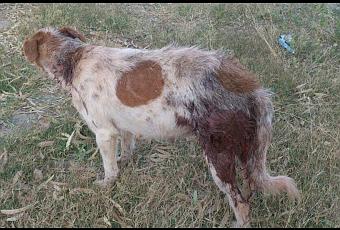 Ella y su hija, la marrón, se quedaron solas y la mamá quedó preñada. Hace unos días sufrió un fuerte ataque por parte de otros perros más grandes y ya veis como quedó (tan blanquita que está en algunas fotos, en las de las heridas esta marrón del revolcon que le dieron).