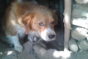 Aún así, tenía sitio para correr y jugar y así lo hizo. Lamentablemente, como en tantos otros casos, al ser un cachorro y no prestarle atención y enseñarle normas de comportamiento, rompió algunas cosas y la familia lo ató a una leñera en el patio... y ahí está desde entonces, atado, sin poder correr ni jugar. Es una pena verlo con esa carita de tristeza metido en su refugio de leña, y atado a unos metros de cadena sin poder recibir ni dar cariño.