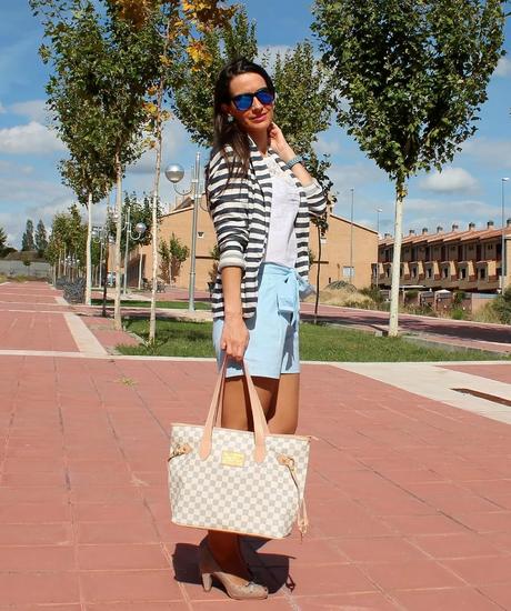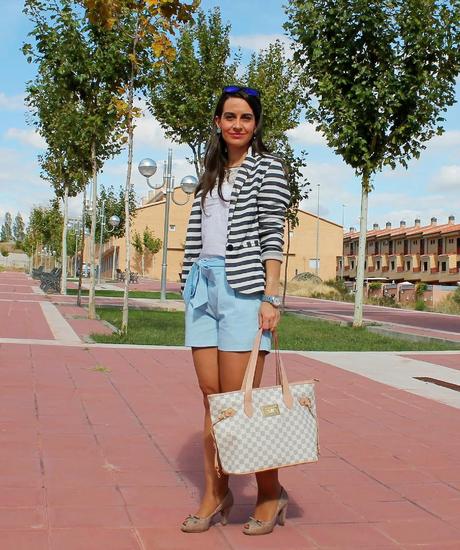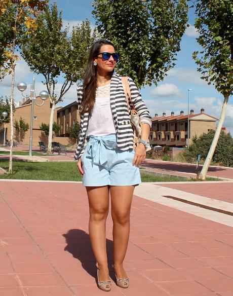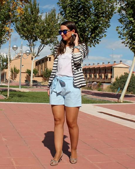En el look de hoy vuelvo a los shorts ( ya sabéis que es mi prenda favorita )y es que tenía muchas ganas de que llegara mi pedido de Sheinside para enseñaros algunas de las cosas que había pedido ;pero claro, como tardan 3 semanas...nada, que se nos ha metido un temporal de lluvias horrible y creo que el resto de las prendas me las tendré que estrenar el verano que viene porque son muy de tirantes y ya no apetecen. Bueno, al menos he podido estrenar estos shorts azul cielo que ya había visto en varios blogs y me encantaban. Como veis he vuelto a utilizar la americana de rayas de Springfield para mi nueva combinación porque me parece muy cómoda para mi día a día.No me enrollo más, espero que os guste mi look. Buen día:) Gracias por vuestros comentarios. Thanks for your lovely comments.