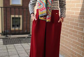 Estos pantalones de peseta son ligeros e ideales para el entretiempo. Con la camiseta de rayas de THE PLAYA & Co., que es todo un básico, y el pañuelo de moniquilla, ya tienes un look bien apañado.