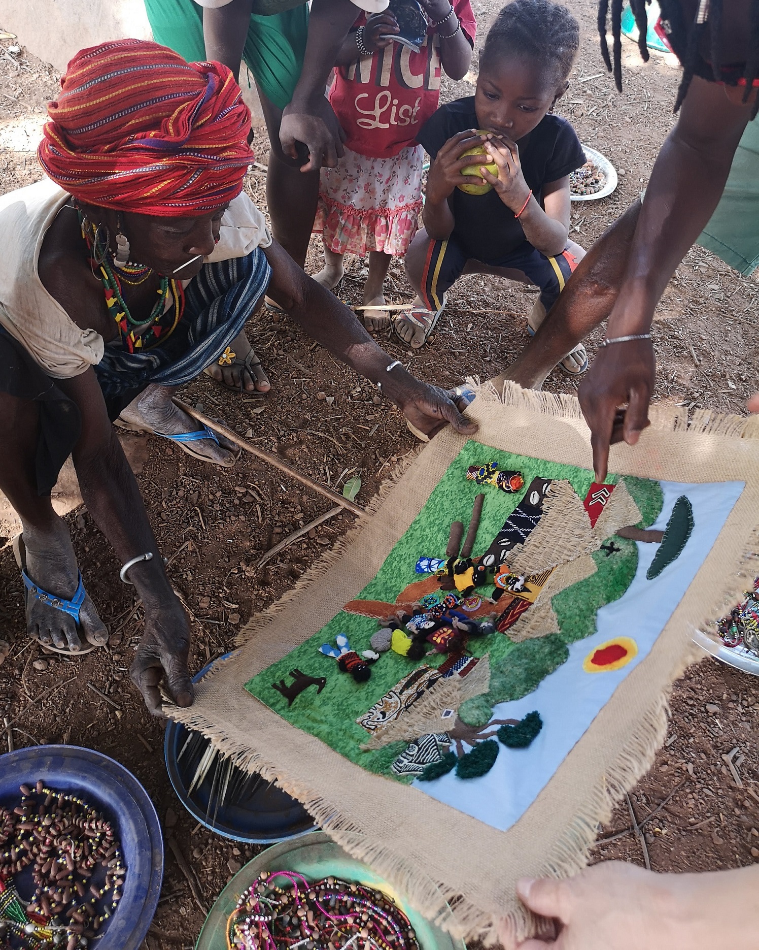 En abril de 2019, en plena época seca, volví a Iwol con la intención de enseñar a Dori que había quedado para siempre en la arpillera que iba a estar a partir de aquel momento en el Chiringuito de mi amigo Arouna en Ibel. No sé si ella lo entendió, pero miraba y miraba la arpillera con cara sorprendida.