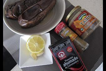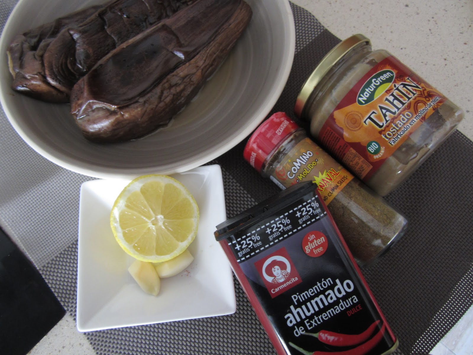Para preparar la receta asé las berenjenas la noche anterior en la Fussion Cook y las dejé en la nevera.Necesitaremos también:Una cucharada de tahín (pasta de sesamo tostado).Zumo de medio limón.Un ajo (yo puse dos pequeños)Media cucharadita de cominos molidos.Aceite de oliva (tres cucharadas para el puré y un chorrito para decorar)Pimentón para decorar.
