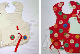 ¿Qué los hace diferentes? En forma nada, son las mismas que hago para los baberos que ya conocéis: los de tamaño estándar (redondos y un poco más alargaditos con el cierre abrazando el cuello), los delantales de tamaño medio y los delantales grandes. También son reversibles y los cierres de lazo y snap ajustables.