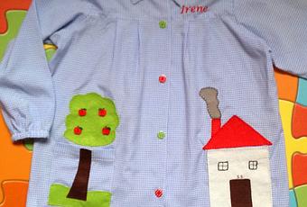En un bolsillo, una casita, el número, el de casa, el 53. En el otro un manzano cargadito de manzanas. Las manzanas son botones de maderita que hemos pintado con esmalte de uñas y rotulador permanente. Los botones del babi, rojos y verdes de lunaritos.