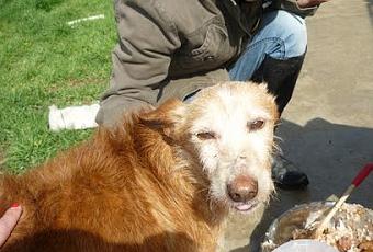 Macho mestizo de Podenco. El pobre prefiere las caricias a la comida