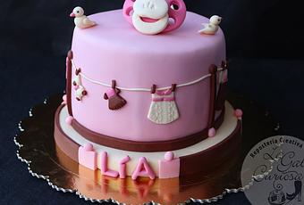 Es un modelo de tarta que hemos preparado otras veces, pero que gusta mucho, a mi me encanta la combinación de colores, desde el marfil al marrón, los tonos rosos, creo que el conjunto es muy armónico. Aunque el modelo es similar ninguna tarta es completamente igual, cambian los detalles de la ropita colgada y cambia en este caso el modelo de chupete que va sobre la tarta.