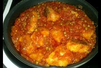En una sarten echamos aceite, cuando empiece a humear, echamos los trozos de bacalao ya en harinados hasta que se doren, una vez que estén dorados, se ponen en papel absorbente, para que no le quede aceite e incorporamos al tomate.Listo para comer, coger el pan y a mojete ar.