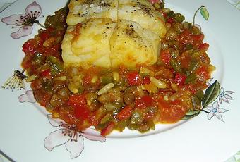 Ingredientes:4 lomos de bacalao desalados500 gr de tomates maduros cortado en brunoise2 cebolletas tiernas cortadas en brunoiseun ajo picadoun pimiento rojo pequeño cortado en brunoiseun pimiento verde pequeño cortado en brunoiseaceite de olivaunas hebras de azafrán25 gr de piñones25 gr de pasassal, pimienta