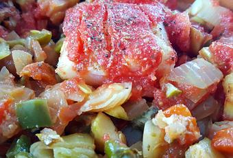 - Ahora rociamos todo con tomate triturado, al que previamente habremos puesto un poco de edulcorante para matar la acidez (le da un toque buenísimo en contraste con el sabor del bacalao y las verduras!)