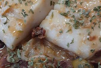 El tiempo exacto dependerá del grosor de la pieza y de nuestro gusto respecto al punto de pescado. Colocar el bacalao en la fuente de servir.