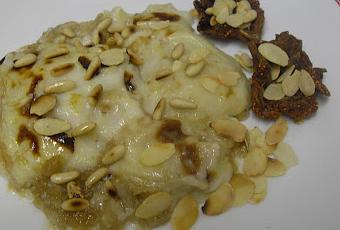 Adornar con los piñones y las almendras laminadas, yo le he añadido unas flores de higo.