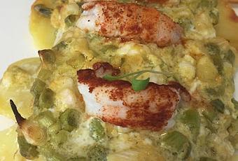 Un lomo de bacalao fresco hermosoUna patataUn par de ajos tiernos Una cucharada de postre de mostazaZumo de limónAceite de oliva extra virgen4 colitas de cigala