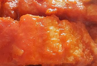 Cuando el tomate esté cocinado añade los lomos de bacalao, primero con la piel hacia arriba, deja que se cocinen unos 5 minutos, da la vuelta y deja que se hagan por el otro lado otros 5 más, en este punto añade los pimientos en tiras y el jugo, deja todo junto unos minutos más, sirve caliente.