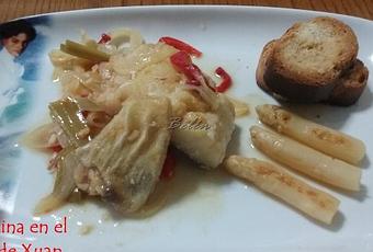 - Servimos el bacalao con una cama de verduras en el fondo del plato, los espárragos a los lados, el pan y espolvoreado con perejil picado.