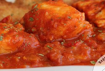 ½ kilo de bacalao al punto de sal 2 cebollas 3 dientes de ajo 1 bote grande de tomate triturado (o unos 4 tomates grandes) 1 bote de pimientos de piquillo o pimientos morrones 1 vaso de vino blanco Perejil, sal, 2 guindillas (opcional), aceite de oliva virgen extra.