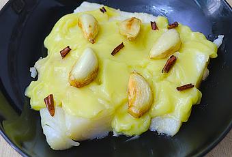 Para terminar serviremos el bacalao en un plato, si vemos que este se ha enfriado lo calentaremos durante unos pocos segundos en el microondas, junto con el pil pil que hemos preparado y los dientes de ajo y guindillas que reservamos al principio.