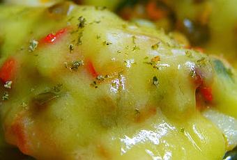 A la hora se servir, emplatamos la tajada de bacalao, encima el pisto y napamos por encima con el pil-pil.