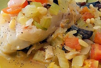 Añadimos los trozos de bacalao escurrido, agregamos el apio, las pasas, los piñones y las aceitunas negras picadas.