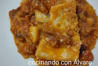 - Cuando veamos que la confitura la tenemos lista, es el momento de añadir el bacalao que teníamos reservado, esparcimos los lomos de bacalao por el fondo de la sartén, y que ellos lentamente se vayan cocinando.