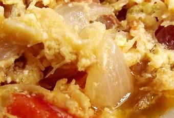 Se hace un sofrito con los tomates, la cebolla y los pimientos. Una vez estén ligeramente cocidos se agrega el bacalao y se deja cocer un poco. Finalmente se agregan los huevos y se mezclan bien.