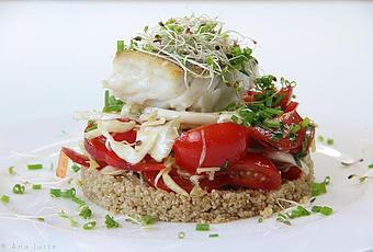 Una idea de receta refrescante y que resulta un plato saludable, equilibrado y muy completo. Apto para dietas sin gluten, gracias al quínoa. Consta de una base de quínoa, una ensalada a base de tomate, col valenciana y pimiento rojo y un filete de bacalao fresco. El bacalao es un pescado muy gustoso pero frágil.