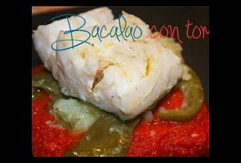 Ponemos las patatas y los pimientos sobre la salsa de tomate, colocamos encima los lomos de bacalao, y vertimos un chorrito de aceite de oliva por encima
