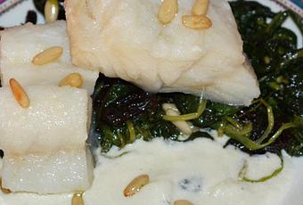 Finalizaremos el plato presentando el bacalao sobre un fondo de espinacas salteadas y la crema de queso Idiazabal.