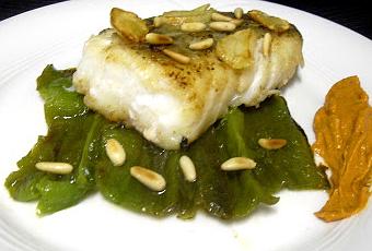 Para su presentación, preparamos una base de pimientos verdes y encima el bacalao con unos pocos piñones tostados y láminas de ajo frito.