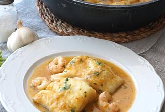 - Un plato de bacalao en salsa con langostinos riquísimo y sencillo que podéis preparar con antelación.