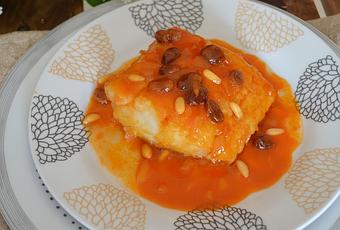 Ingredientes: 4 personas4 lomos de bacalao1 cebolleta grande o 2 pequeñasharina para rebozar el bacalao1 cucharadita de harina1 cucharadita de pimentón agridulce1 cucharada de mielaceite de oliva. uvas pasas (al gusto) 1 cucharada de piñonessal