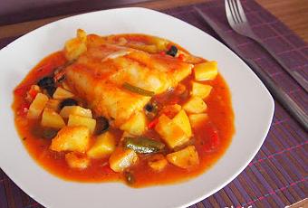 - Cortar el bacalao en trozos del tamaño deseado (cuanto más grandes sean los trozos más tiempo tardará en hacerse). Añadirlo a la salsa con la piel hacia abajo. Dejar cocinar unos 8 minutos.