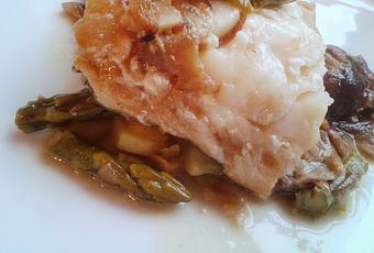 INGREDIENTES: un manojo de espárragos, unas setas o champiñones, 1 cebolla hermosa, unos dientes de ajo, un buen vaso de vino blanco, tomillo, aceite, un poco de agua por si hiciera falta, 2 lomos de bacalao y un poco de sal.