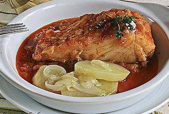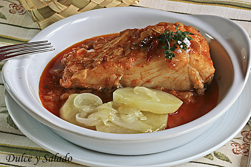 - Colocar el bacalaco en la salsa, con la piel hacia abajo y dejar que cueza a temperatura muy baja unos 10 minutos (debe cocerse muy poco para que no se pase de cocción y resulte jugoso).