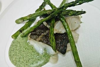 Se cocinan los espárragos a la plancha y se sirve un poco de salsa en el plato, se coloca el bacalao encima y por último los espárragos.